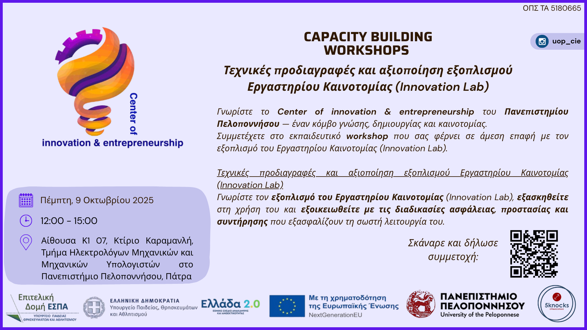 Τα Capacity Building Workshops γίνονται πραγματικότητα στους χώρους του Πανεπιστημίου Πελοποννήσου, με στόχο την ενίσχυση των γνώσεων και δεξιοτήτων των συμμετεχόντων σε τομείς όπως η τεχνολογία, η καινοτομία και η έρευνα. Μέσα από στοχευμένες θεματικές και βιωματική προσέγγιση, οι συμμετέχοντες έρχονται σε επαφή με σύγχρονες πρακτικές και εργαλεία, αξιοποιώντας παράλληλα τις δυνατότητες του Innovation Lab.