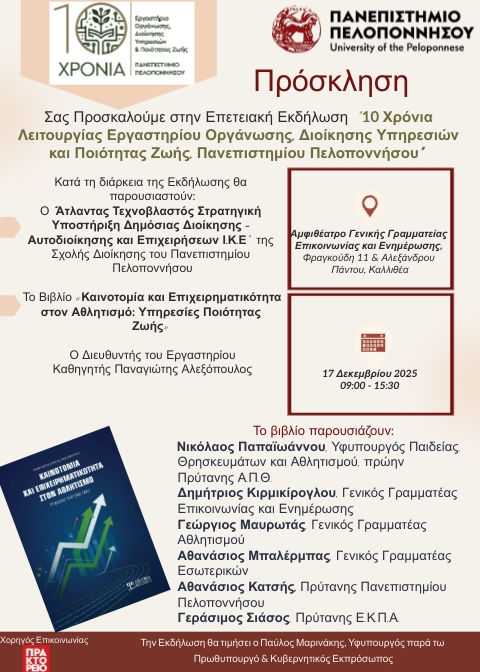 Θα θέλαμε με ιδιαίτερη χαρά να σας προσκαλέσουμε στην Επετειακή Εκδήλωση για τα «10 Χρόνια Λειτουργίας του Εργαστηρίου Οργάνωσης, Διοίκησης Υπηρεσιών και Ποιότητας Ζωής», του Τμήματος Οργάνωσης και Διαχείρισης Αθλητισμού, η οποία θα πραγματοποιηθεί την Τετάρτη 17 Δεκεμβρίου 2025, από 09:00 έως 15:30, στο Αμφιθέατρο της Γενικής Γραμματείας Επικοινωνίας και Ενημέρωσης (Φραγκούδη 11 & Αλεξάνδρου Πάντου, Καλλιθέα).