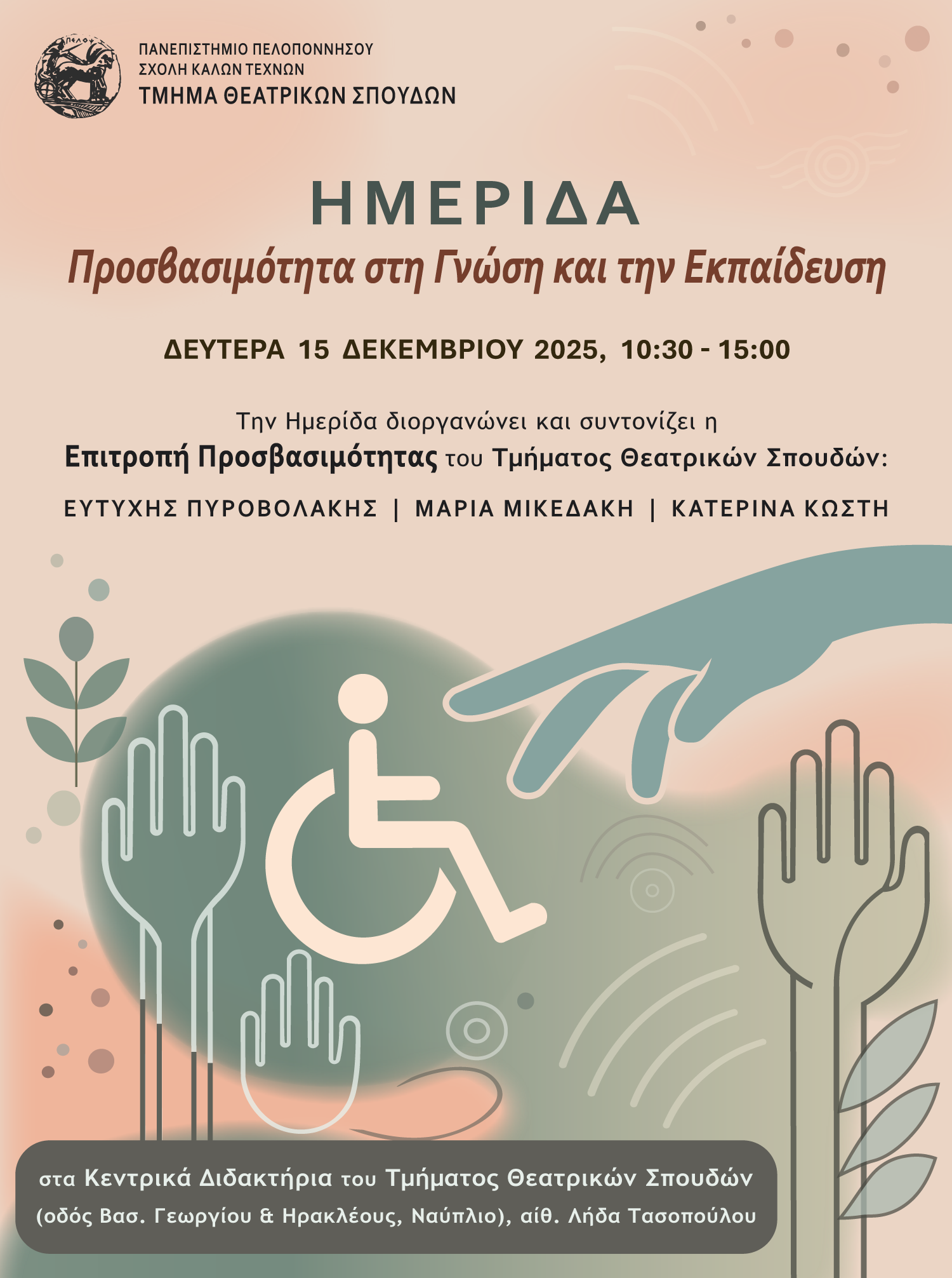 Με αφορμή την 3η Δεκεμβρίου, Παγκόσμια Ημέρα Ατόμων με Αναπηρία, η Επιτροπή Προσβασιμότητας του Τμήματος Θεατρικών Σπουδών του Πανεπιστημίου Πελοποννήσου διοργανώνει την Ημερίδα με τίτλο «Προσβασιμότητα στη γνώση και την εκπαίδευση», στις 15 Δεκεμβρίου 2025, από 10:30 έως 15:00, στην αίθουσα Λήδας Τασοπούλου (1ος όροφος) στα Κεντρικά Διδακτήρια του Τμήματος (Βασ. Γεωργίου & Ηρακλέους, Ναύπλιο).