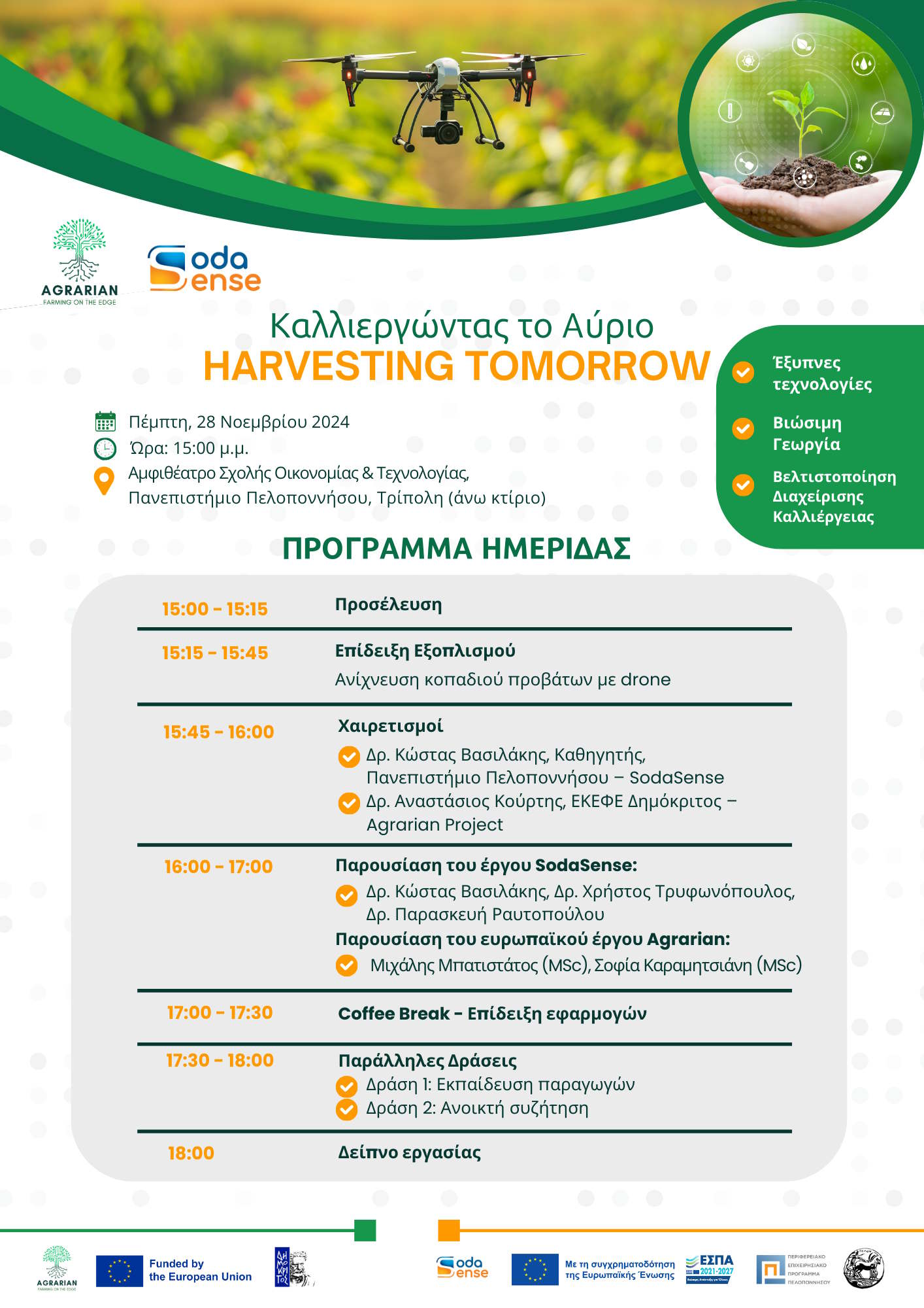 Πραγματοποίηση Ημερίδας στο Πανεπιστήμιο Πελοποννήσου στην Τρίπολη με θέμα “Καλλιεργώντας το αύριο: Ημερίδα για τις νέες τεχνολογίες και προκλήσεις στη γεωργία ακριβείας”. Η Ημερίδα διοργανώνεται από δυο ερευνητικά έργα, τα AGRARIAN και SodaSense.