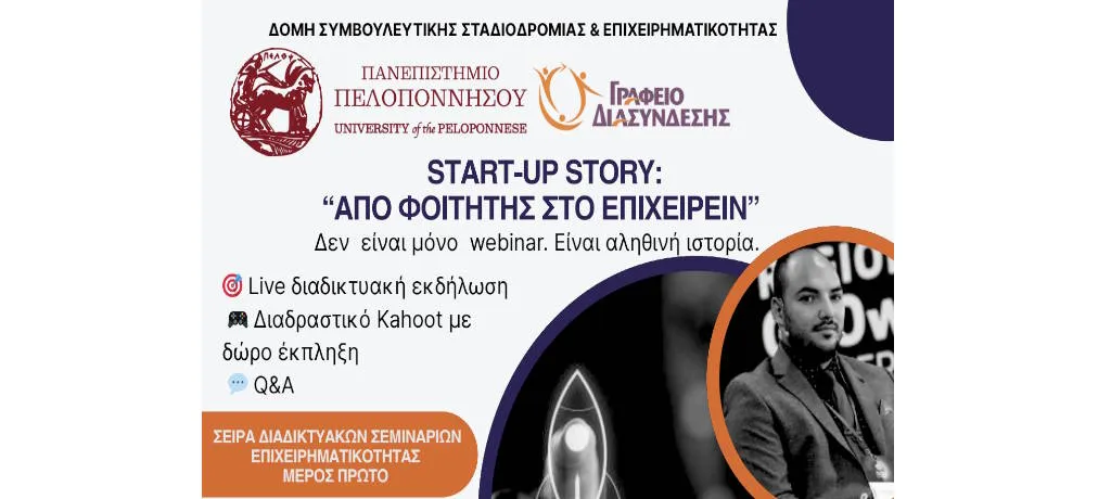 🚀 Θέλεις να δεις πώς μια ιδέα γίνεται startup; Έλα στον Κύκλο Διαδικτυακών Σεμιναρίων Επιχειρηματικότητας & Startups του Πανεπιστημίου Πελοποννήσου!