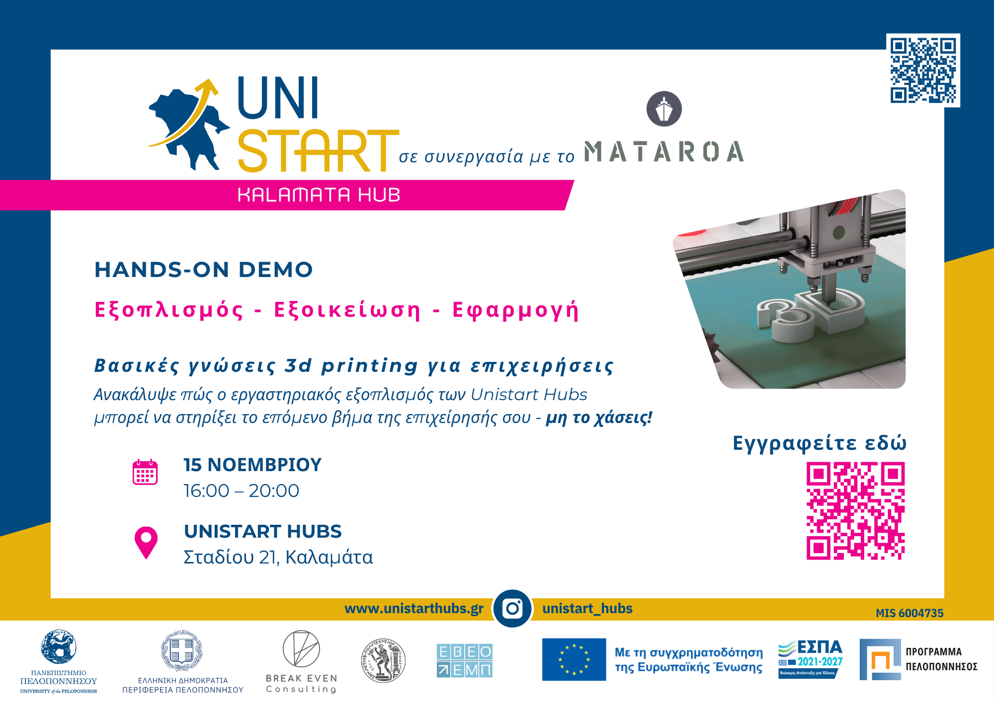 Τα UniStart Hubs, σε συνεργασία με την ΑΜΚΕ Mataroa, διοργανώνουν την εκδήλωση «Βασικές γνώσεις 3D printing για επιχειρήσεις», το Σάββατο 15 Νοεμβρίου, 16:00–20:00, στον χώρο των UniStart Hubs στην Καλαμάτα (Σταδίου 21).