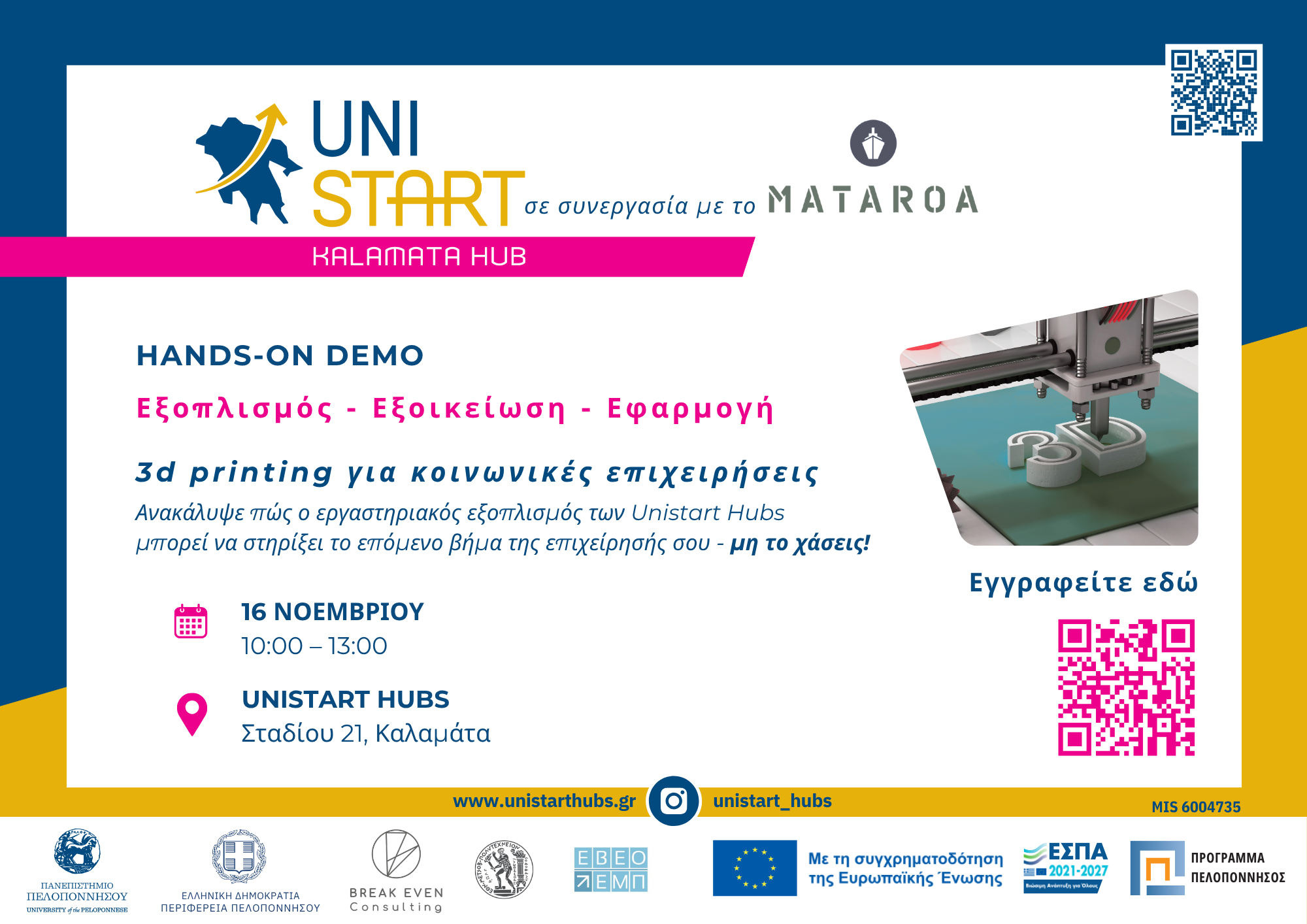 Τα UniStart Hubs, σε συνεργασία με την ΑΜΚΕ Mataroa, σε προσκαλούν στην εκδήλωση «3D Printing για Κοινωνικές Επιχειρήσεις», την Κυριακή 16 Νοεμβρίου, 10:00 - 13:00, στον χώρο των UniStart Hubs στην Καλαμάτα (Σταδίου 21).