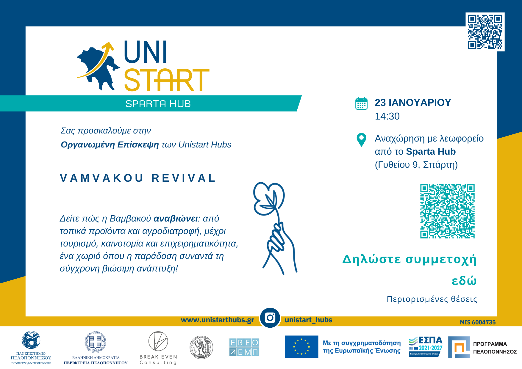 Τα UniStart Hubs διοργανώνουν οργανωμένη επίσκεψη στη Βαμβακού Λακωνίας, ένα ολοκληρωμένο παράδειγμα τοπικής ανάπτυξης που συνδυάζει εκπαίδευση, επιχειρηματικότητα, καινοτομία και ψηφιακές εφαρμογές.