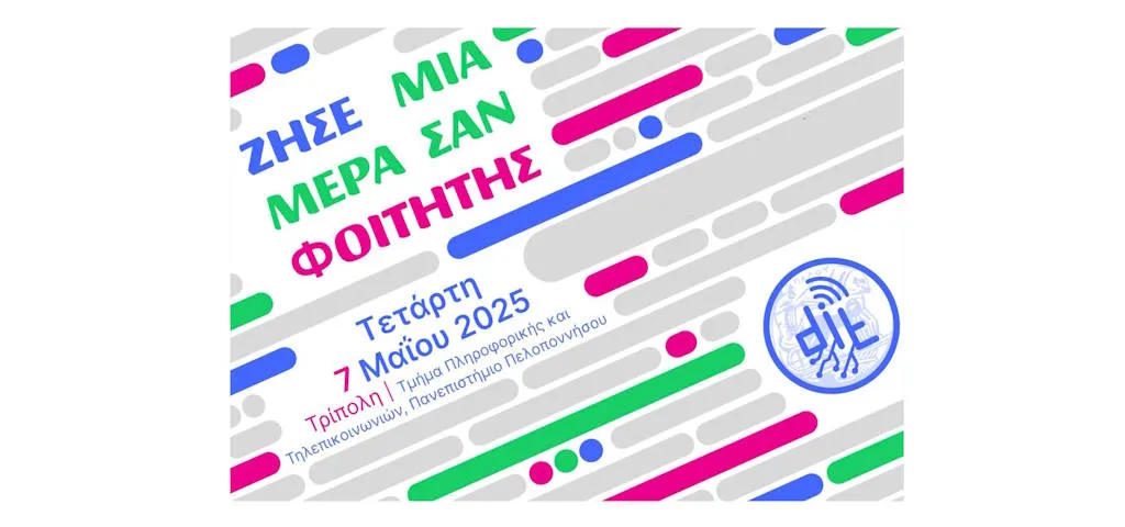 Την Τετάρτη 7 Μαΐου 2025, το Τμήμα Πληροφορικής και Τηλεπικοινωνιών θα φιλοξενήσει για 4η συνεχόμενη χρονιά τη δράση "Ζήσε μια μέρα σαν φοιτητής". Πρόκειται για μια εκδήλωση ανοιχτή σε σχολεία δευτεροβάθμιας εκπαίδευσης, με στόχο να προσφέρει στους μαθητές την εμπειρία μιας ημέρας στο Πανεπιστήμιο: στους χώρους του, στα εργαστήριά του, αλλά κυρίως, κοντά στους ανθρώπους του.