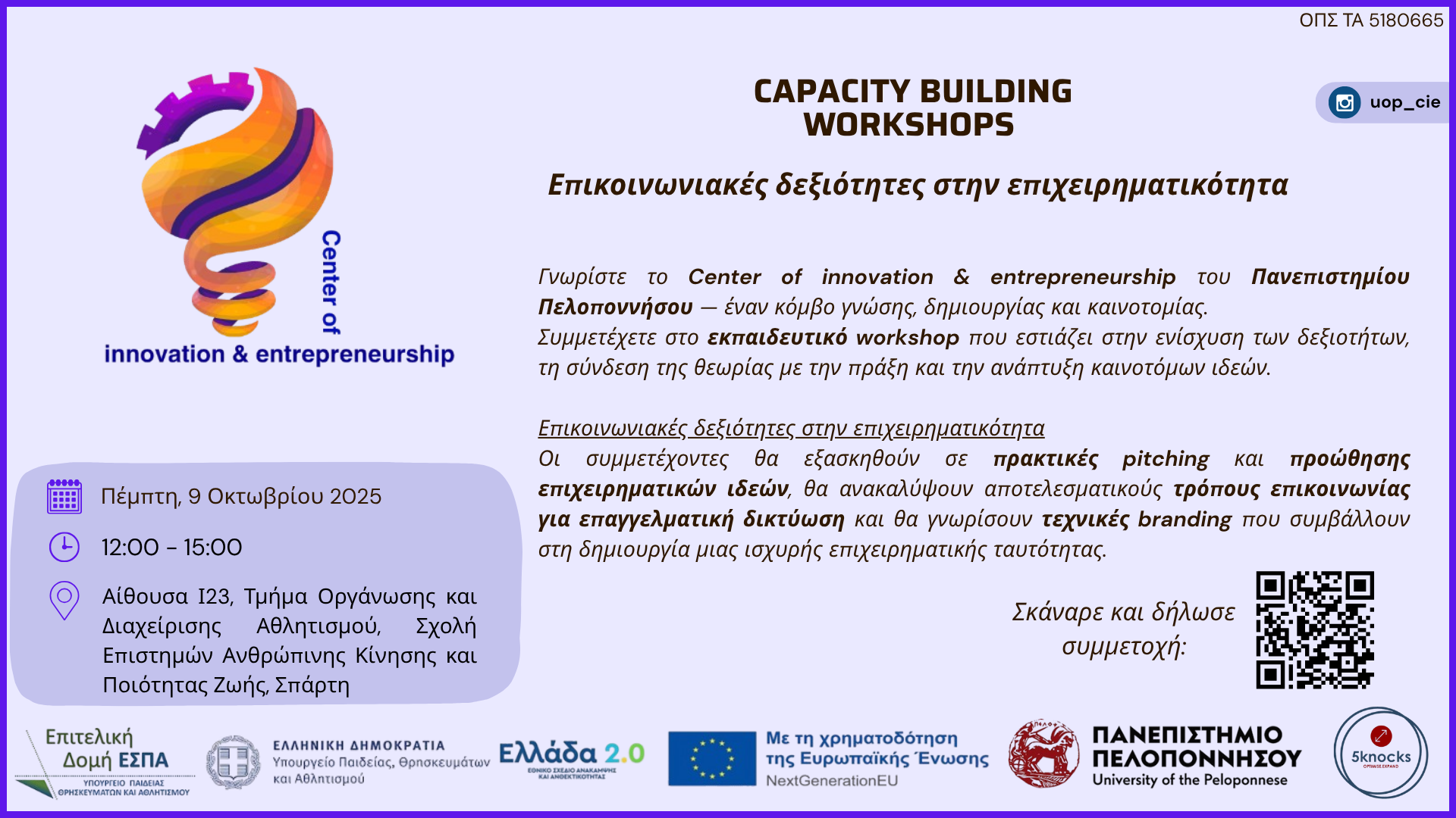 Γνωρίστε το Center of innovation & entrepreneurship του Πανεπιστημίου Πελοποννήσου — έναν κόμβο γνώσης, δημιουργίας και καινοτομίας.