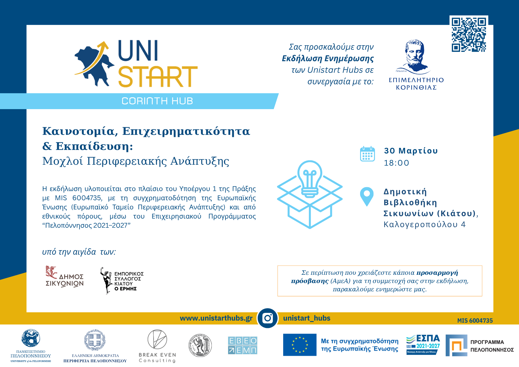 Τα UniStart Hubs σας προσκαλούν σε εκδήλωση ενημέρωσης κοινού με τίτλο «Καινοτομία, Επιχειρηματικότητα & Εκπαίδευση: Μοχλοί Περιφερειακής Ανάπτυξης», η οποία θα πραγματοποιηθεί τη Δευτέρα 30 Μαρτίου 2026, στις 18:00, στη Δημοτική Βιβλιοθήκη Σικυωνίων στο Κιάτο, σε συνεργασία με το Επιμελητήριο Κορινθίας και υπό την αιγίδα του Δήμου Σικυωνίων και του Εμπορικού Συλλόγου Κιάτου «Ο ΕΡΜΗΣ».
