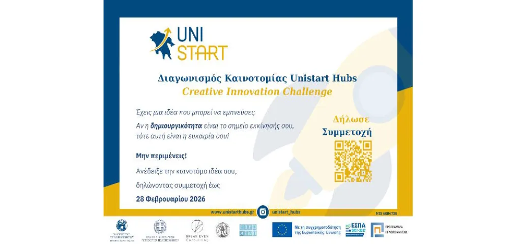 Τα UniStart Hubs (Δομές Επιχειρηματικότητας και Καινοτομίας του Πανεπιστημίου Πελοποννήσου) σας προσκαλούν να συμμετάσχετε στον Διαγωνισμό Καινοτομίας Creative Innovation Challenge. Η πρόσκληση απευθύνεται σε όσους θέλουν να καταθέσουν μία ιδέα — από μια αρχική σκέψη μέχρι μια πιο ολοκληρωμένη πρόταση — που συνδυάζει δημιουργικότητα, τέχνη, πολιτισμό και τεχνολογία.