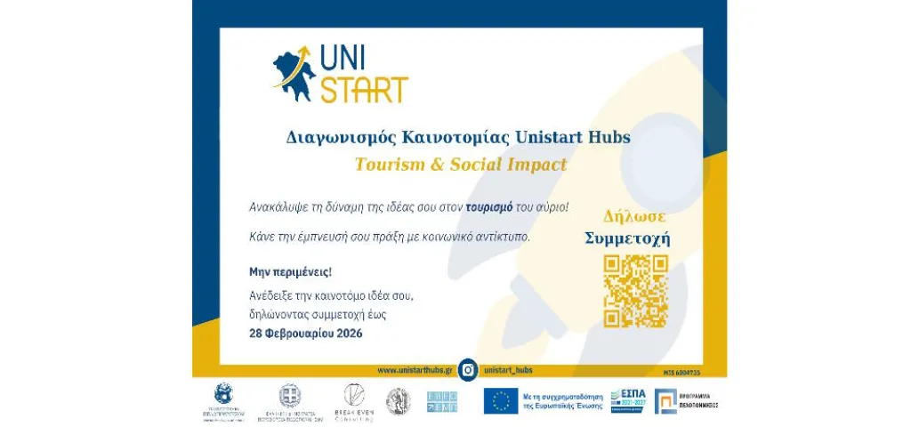 Τα UniStart Hubs (Δομές Επιχειρηματικότητας και Καινοτομίας του Πανεπιστημίου Πελοποννήσου) σας προσκαλούν να λάβετε μέρος στον Διαγωνισμό Καινοτομίας Tourism & Social Impact. Ο διαγωνισμός είναι ανοιχτός σε ιδέες κάθε επιπέδου που προτείνουν πιο βιώσιμες, κοινωνικά υπεύθυνες και καινοτόμες προσεγγίσεις στον τουρισμό και τη σχέση του με τις τοπικές κοινότητες.