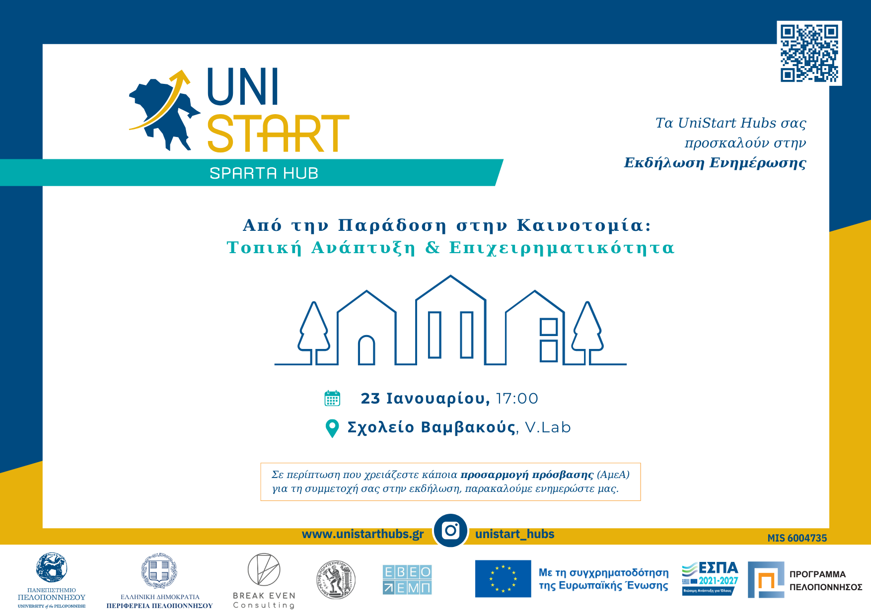 Τα UniStart Hubs σας προσκαλούν σε Εκδήλωση Ενημέρωσης Κοινού με τίτλο «Από την Παράδοση στην Καινοτομία: Τοπική Ανάπτυξη & Επιχειρηματικότητα», η οποία θα πραγματοποιηθεί την Πέμπτη 23 Ιανουαρίου 2026, στις 17:00, στο Σχολείο Βαμβακούς (V.Lab).